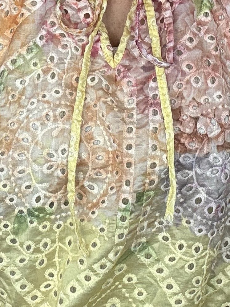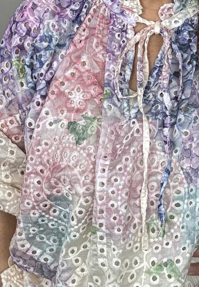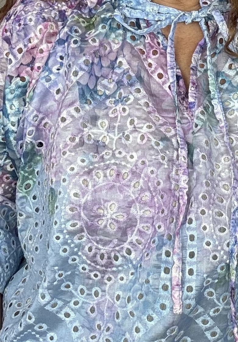 Een prachtige, speelse broderie blouse met een subtiel tie-dye effect. Deze blouse is verkrijgbaar in vier verschillende kleuren, zodat er altijd een tint is die bij jouw stijl past. Het charmante strikdetail en de elegante pofmouwen geven de blouse een vrouwelijke en trendy uitstraling. Perfect om zowel casual als chic te combineren!