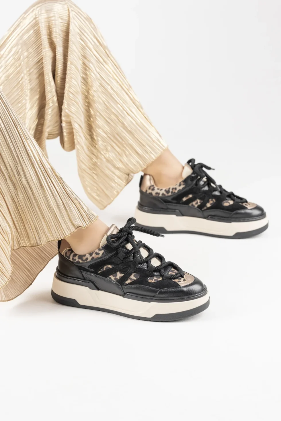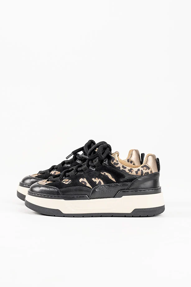 De Walton sneaker met leopard stof is nieuw bij DWRS. Een sneaker met een hoge / dikke zool als dit model is een must in je schoenenkast. Deze sneaker voor dames is aan de buitenzijde van leer en leopard stof en de binnenzijde is volledig van leer. Met de dikke veters door de schoen val je zeker op! Doe jij mee met de trend?