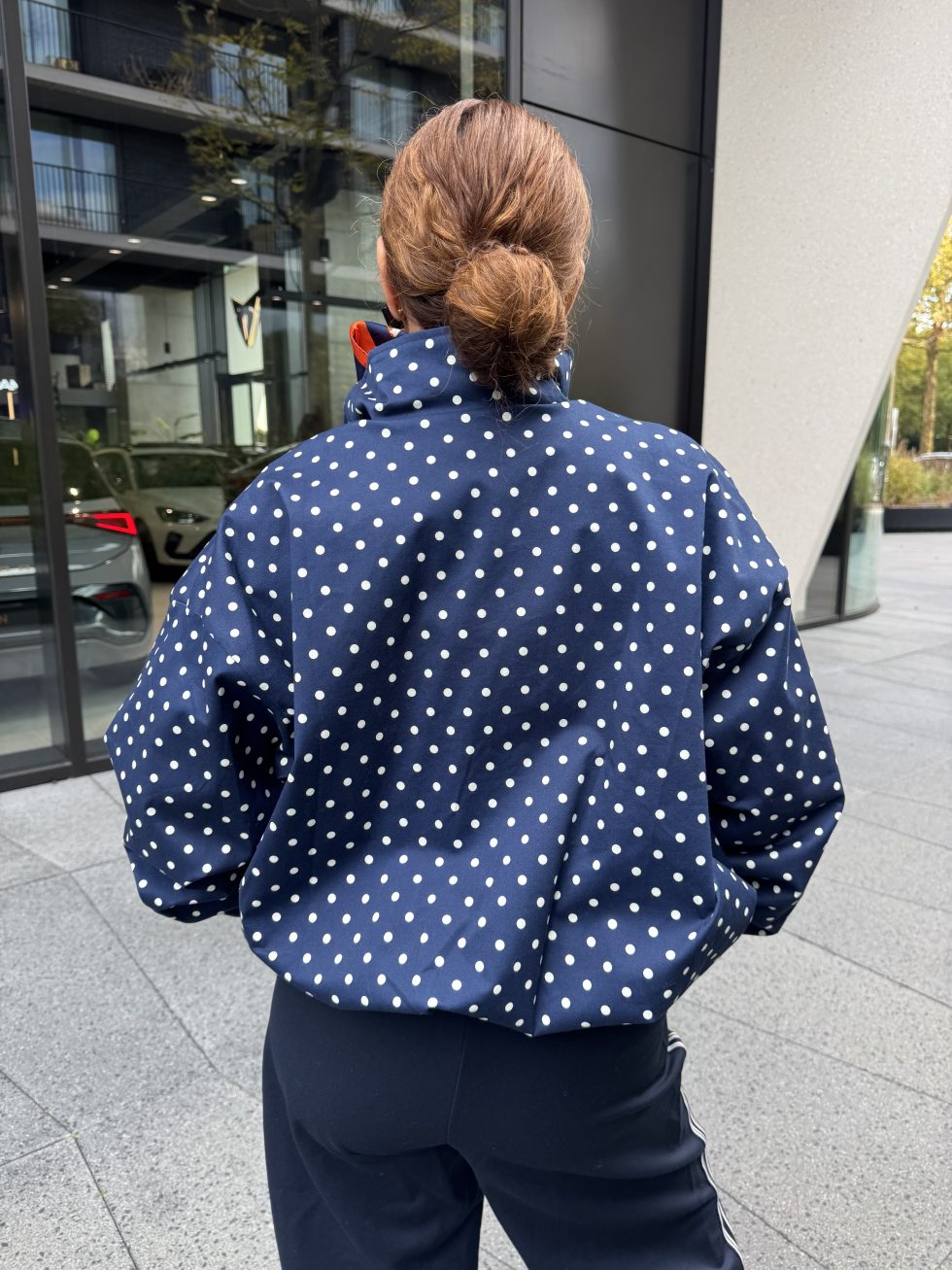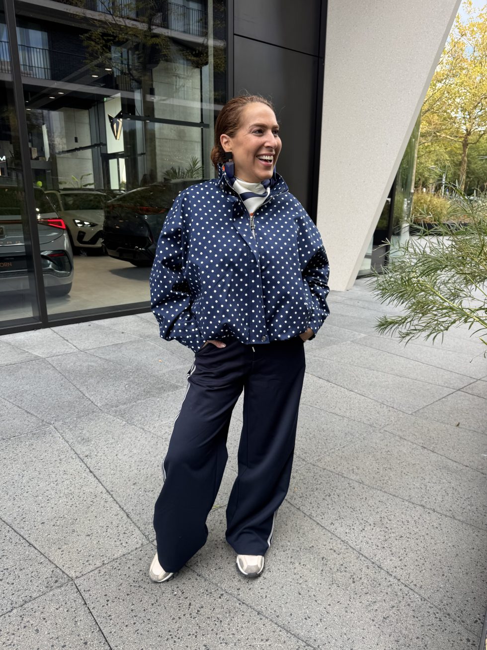 Hoe leuk is dit jasje?! Perfect voor het najaar, met speelse polka dots die jouw look nét dat beetje extra geven. Verkrijgbaar in blauw en in bruin met witte dots. Het model is wat oversized en je kunt hem onderaan een beetje poffen voor een stoer effect. Fijn detail: er past ook makkelijk een dikke trui onder. One size, geschikt van maat S t/m L/XL.