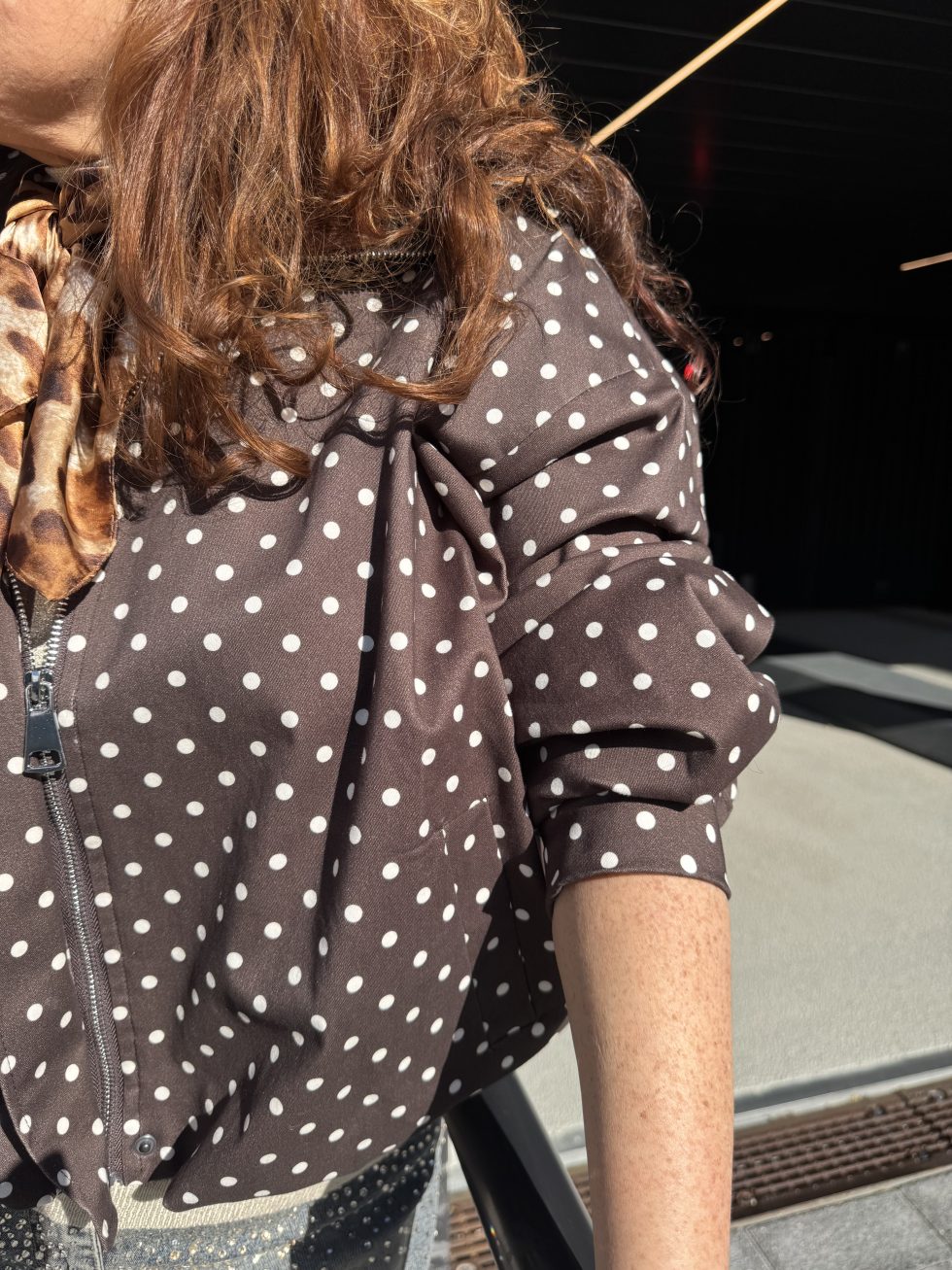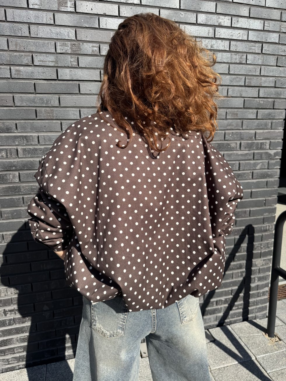 Hoe leuk is dit jasje?! Perfect voor het najaar, met speelse polka dots die jouw look nét dat beetje extra geven. Verkrijgbaar in blauw en in bruin met witte dots. Het model is wat oversized en je kunt hem onderaan een beetje poffen voor een stoer effect. Fijn detail: er past ook makkelijk een dikke trui onder. One size, geschikt van maat S t/m L/XL.