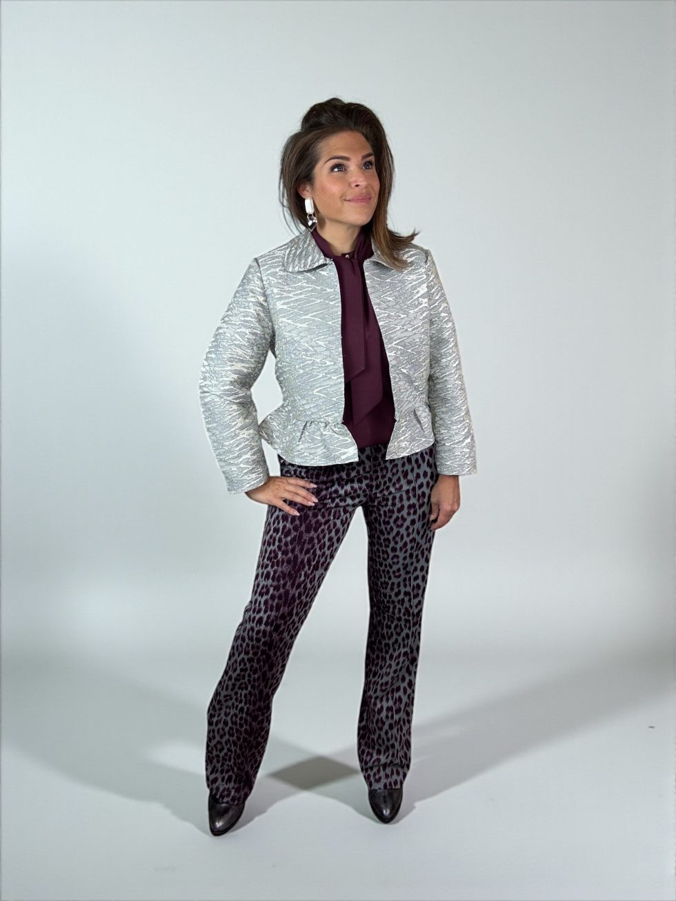 Elegante korte jas met structuur en glanzende details. Klassieke kraag en verborgen sluiting.