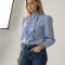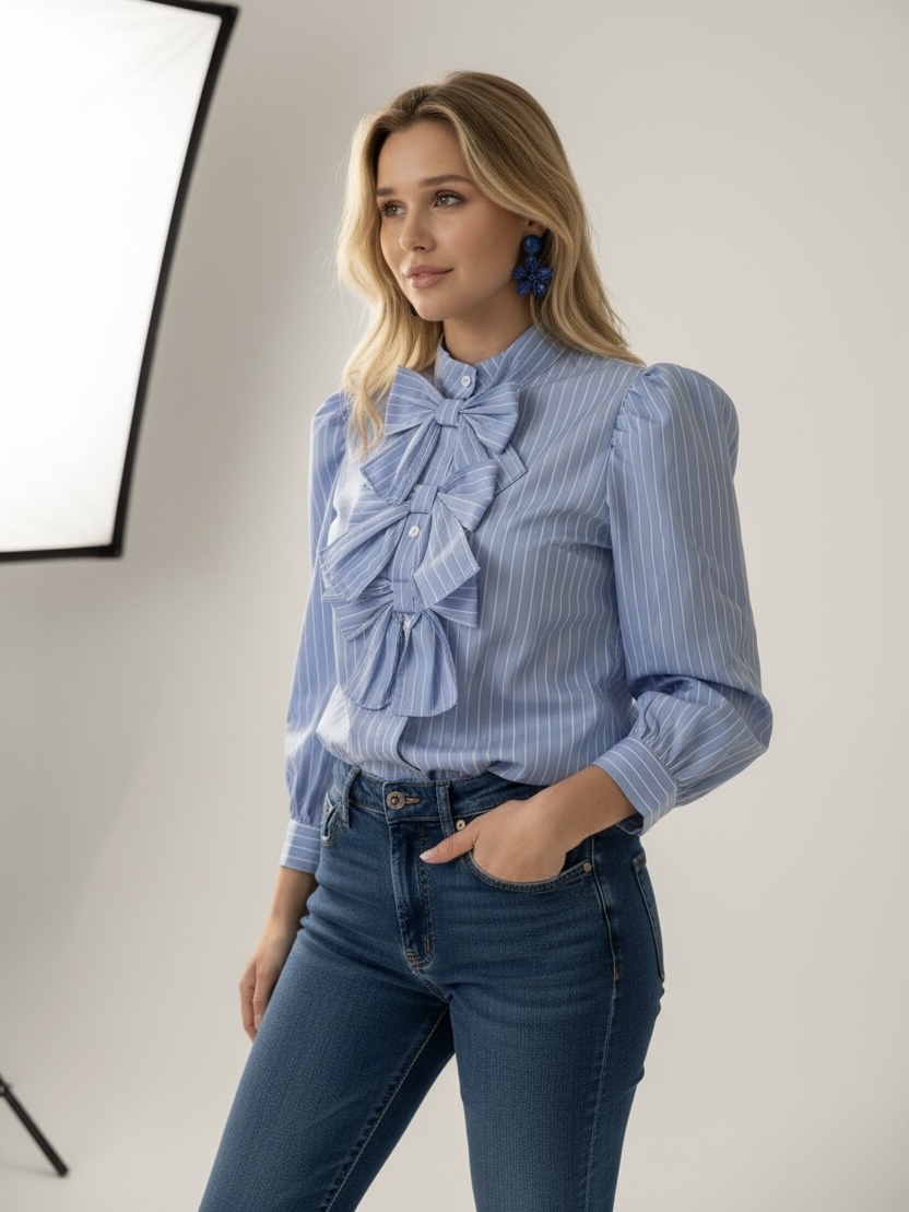De blouse heeft prachtige pofmouwtjes die zorgen voor een speels en elegant silhouet. Aan de voorkant is hij afgewerkt met drie stijlvolle strikken, wat de blouse een unieke en fashionable uitstraling geeft. De hals sluit mooi hoog aan bij de nek, waardoor het geheel een verfijnde en nette look krijgt.